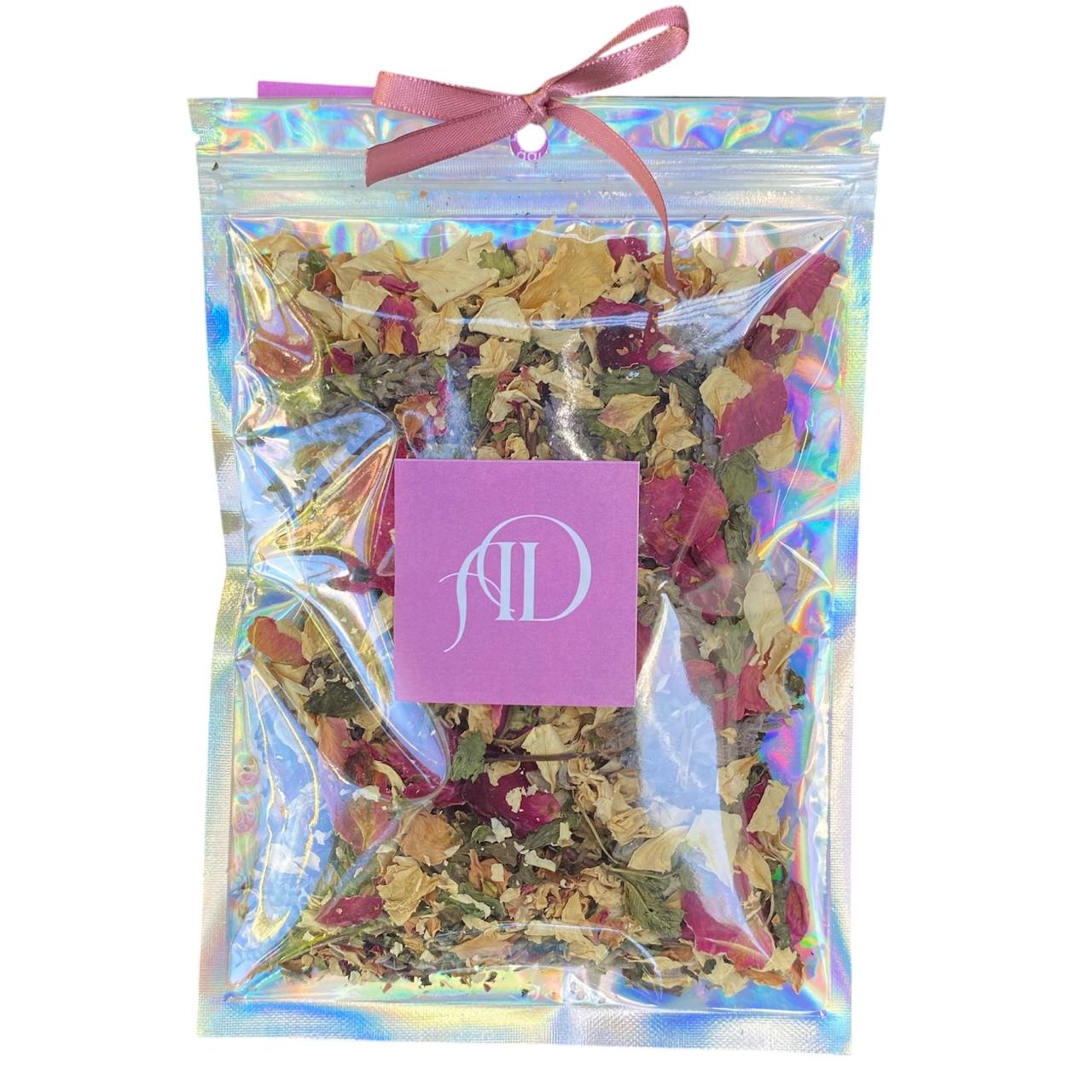 Ingredientes: Pétalas de Rosas cor-de-rosa, hortelã, flor de Lavanda, sais e especiarias com um toque especial da nossa alquimista.